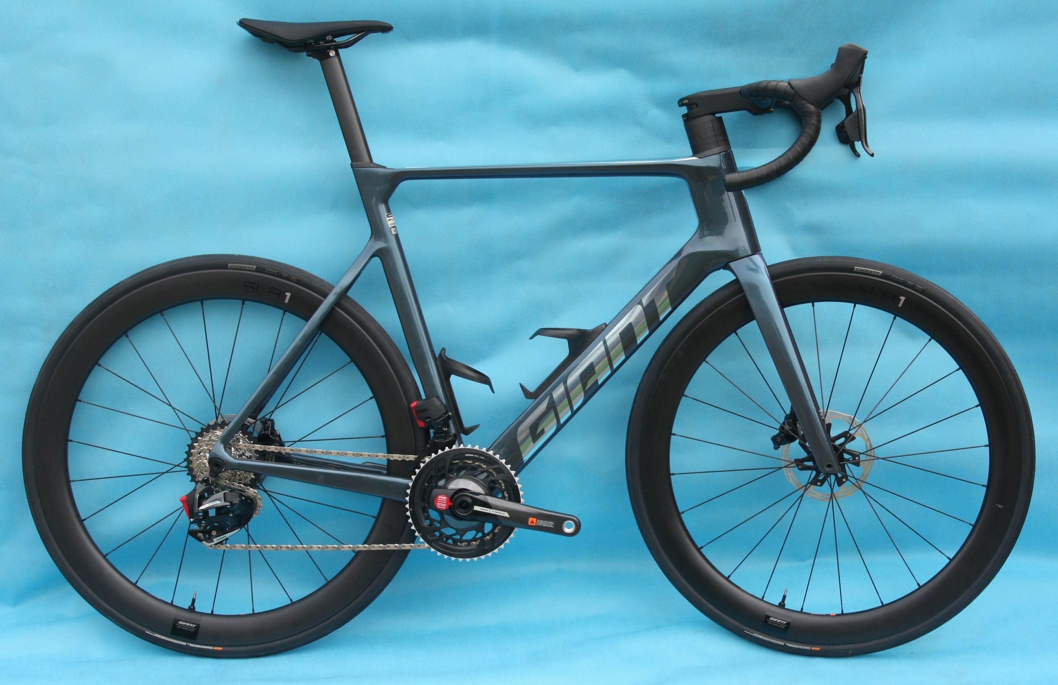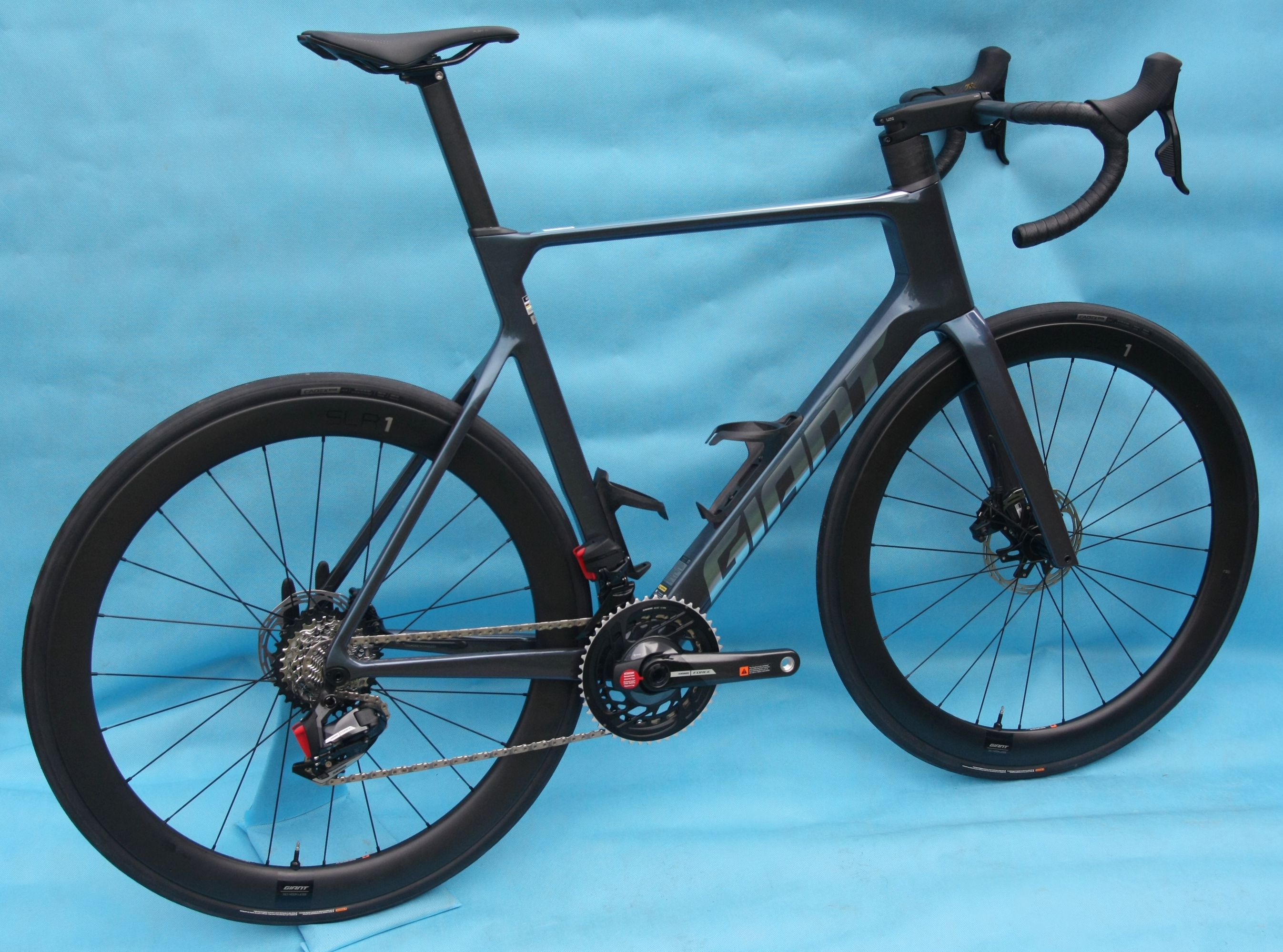 (DMOC byla 167999 Kč). Závodní silniční aero kolo s karbonovým rámem Advanced Composite. 2x12 převodů s elektronickým řazením, Sram Force eTap AXS s wattmetrem. Kola Giant SLR-1 50 Carbon Factory Tubeless.