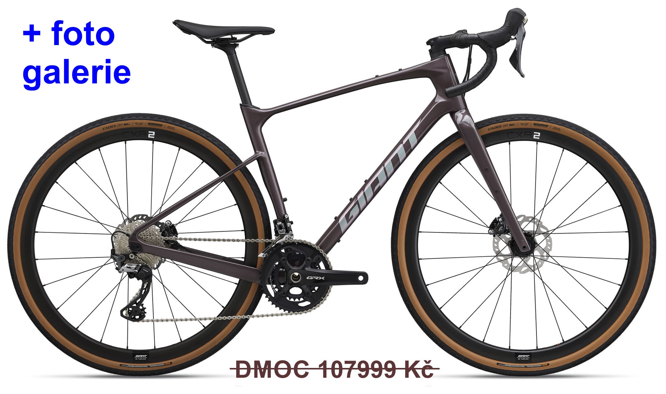 (DMOC byla 107999 Kč). Skvěle vybavené gravel kolo s inovovaným karbonovým rámem Advanced Composite. 2x11 převodů, komponenty Shimano GRX 810 včetně hydraulických brzd, kliky S. GRX 810, karbonová sedlovka a doplňky Giant. Kola Giant CXR-2 Carbon Factory Tubeless.